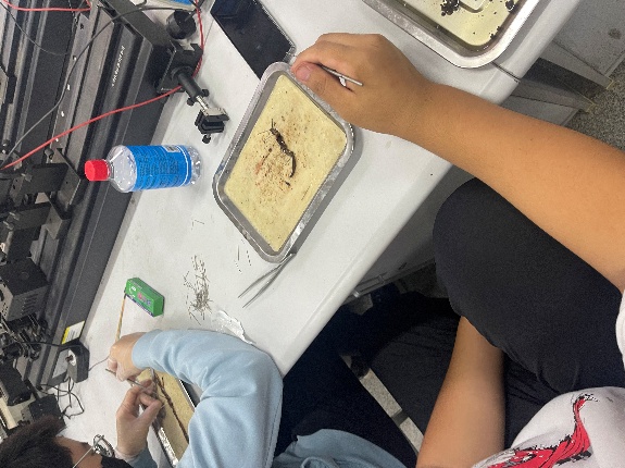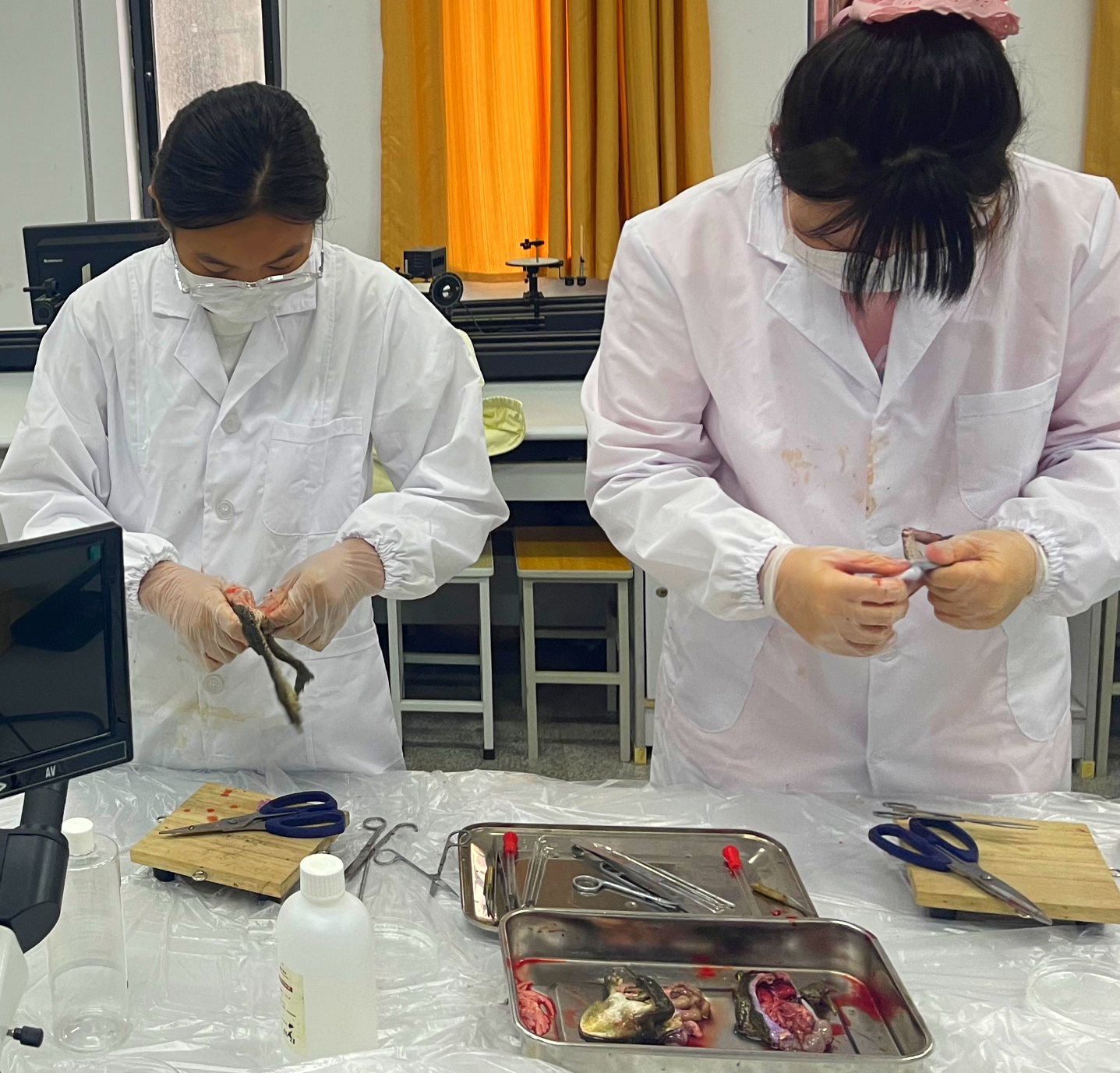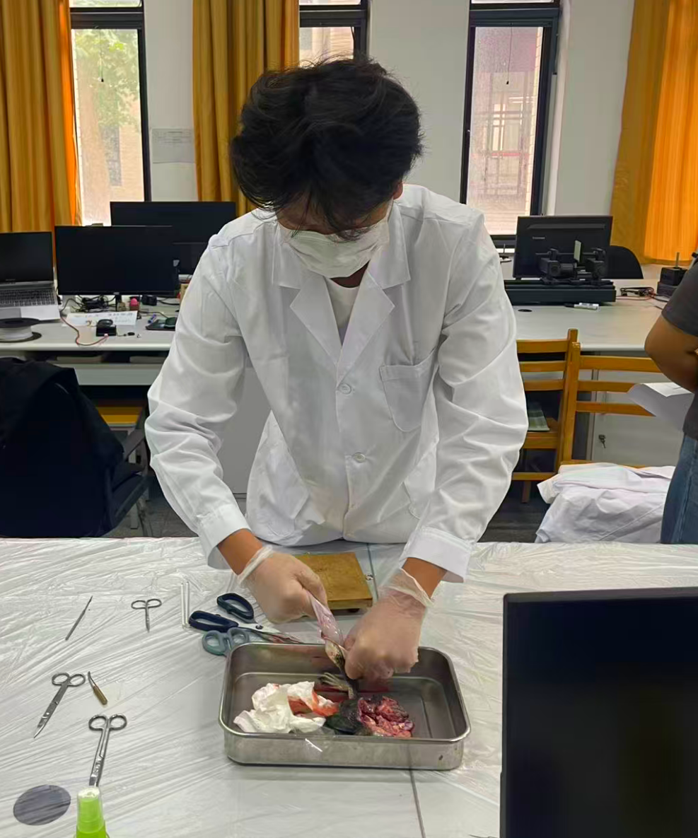 比赛现场,各项目同步展开。参赛选手操作严谨、沉着专注:植物切片项目中,同学们手法稳健,成功制作出符合要求的临时装片;环毛蚓解剖环节,大家在解剖后准确说出内部结构;牛蛙标本制备区域,选手们精准分离神经与肌肉,展现出扎实的基本功。评委老师们在赛场间巡视,不时驻足观察,并对选手的操作进行记录与评分。