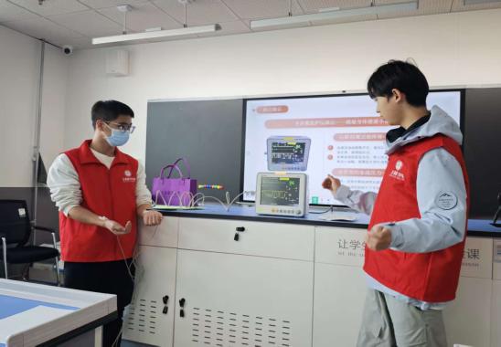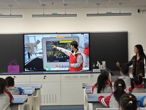志愿者们以“我是小小生命侦探”互动问答开场,用“心脏是小水泵、血液是快递员”的趣味比喻,带领同学们认识心跳、脉搏等生理信号;博而思志愿者现场演示多参数监测仪、单极导联心电采集设备,把抽象的“心跳”转化为屏幕上的波形曲线,告诉同学们“这是心脏的悄悄话”。